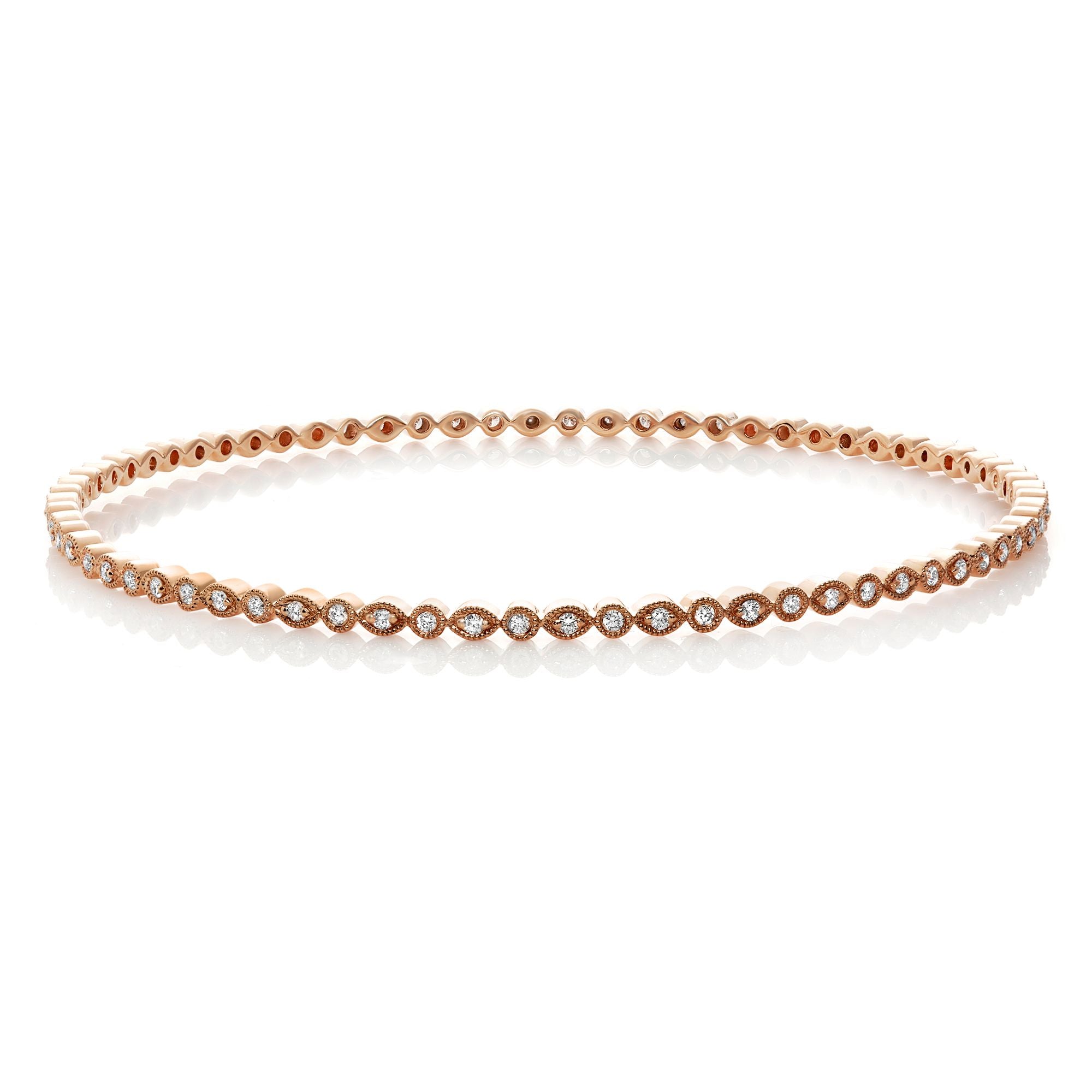 This diamond bracelet features round brilliant diamonds set with delicate milgrain detailing. Milgrain, an ancient goldsmithing technique once practiced by the Egyptians and Etruscans, later came to embody the opulence of imperial courts. Inspired by the diamond glamour of Empress Sissi of Austria, milgrain gained prominence in the early 20th century as a hallmark of fine jewelry, adorning high-society events and elegant soirées with its refined dotted texture.